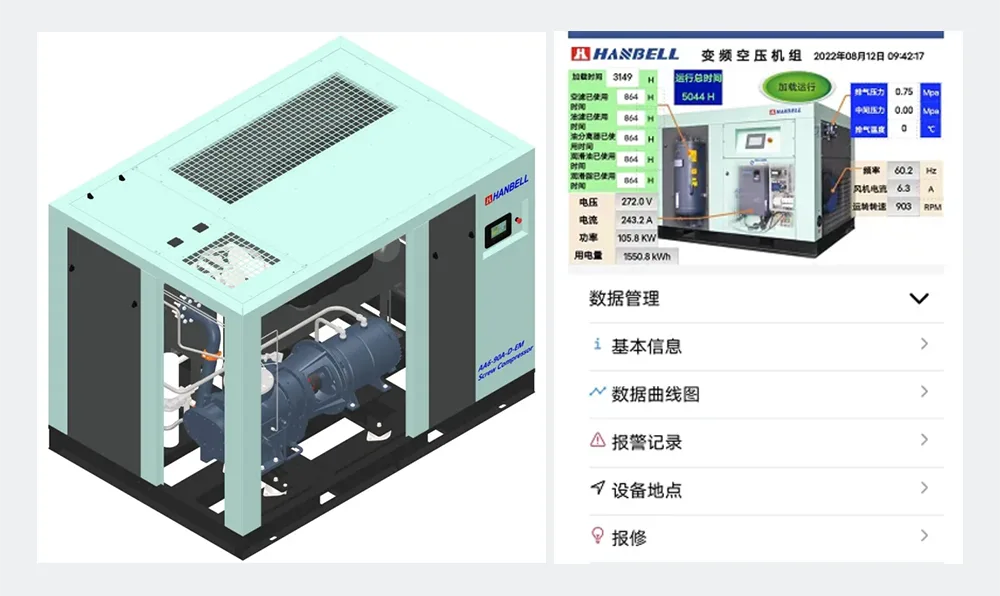 Los compresores de aire de tornillo de frecuencia variable y compresión de dos etapas de Hanbell están equipados con un sistema de servicio en la nube. A través de la tecnología de Internet de las cosas, realiza funciones como monitoreo remoto, servicio posventa remoto, alarma de fallas y seguimiento de ubicación de equipos. A través de una gran cantidad de análisis de datos, proporciona una base de datos objetiva para la mejora, el mantenimiento y el estado de salud del equipo.